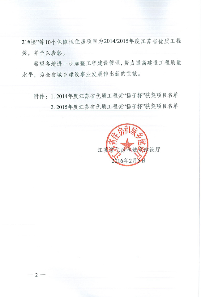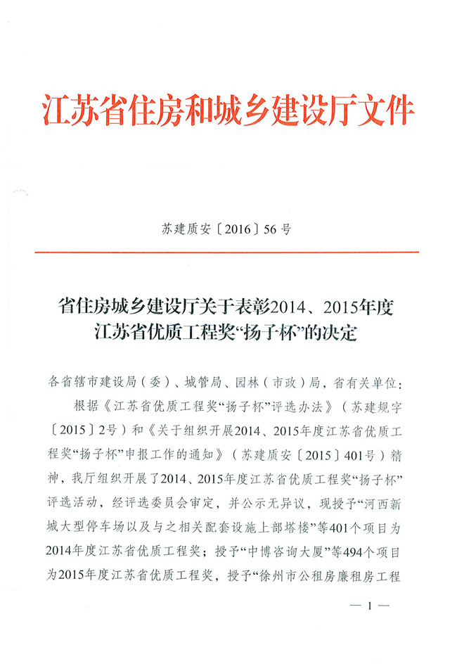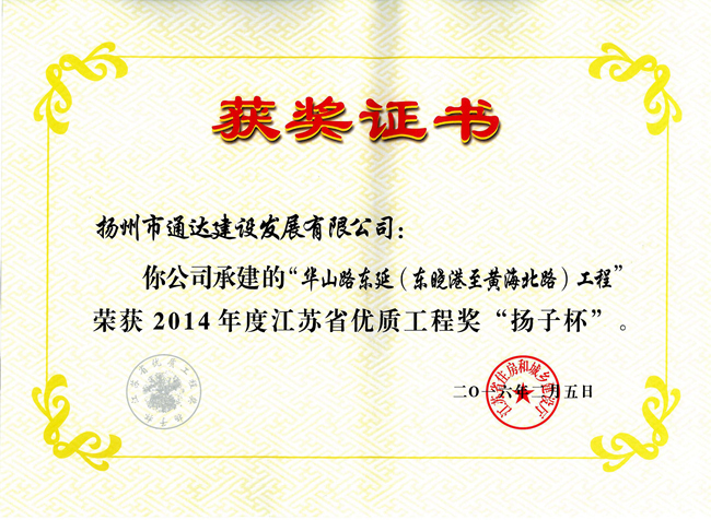 2016年2月5日,我公司承建的华山路东延(东晓港至黄海北路)工程被江苏省住房和城乡建设厅评为江苏省优质工程奖“扬子杯”。