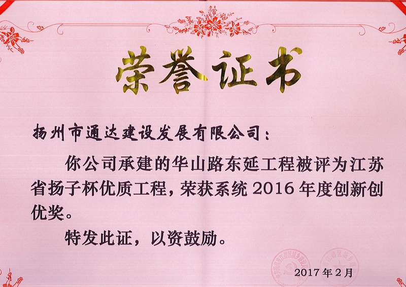 2017年2月,我公司承建的华山路东延(东晓港至黄海北路)工程荣获系统2016年度创新创优奖。