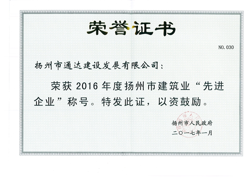 2017年1月,我公司被扬州市人民政府评为2016年度扬州市建筑业“先进企业”称号。