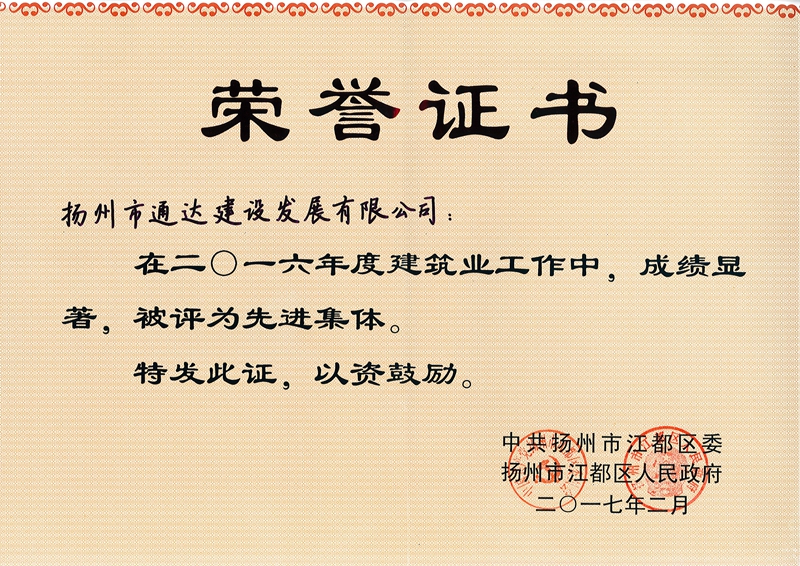 2017年2月,我公司被扬州市江都区人民政府评为2016年度扬州市建筑业“先进集体”称号。