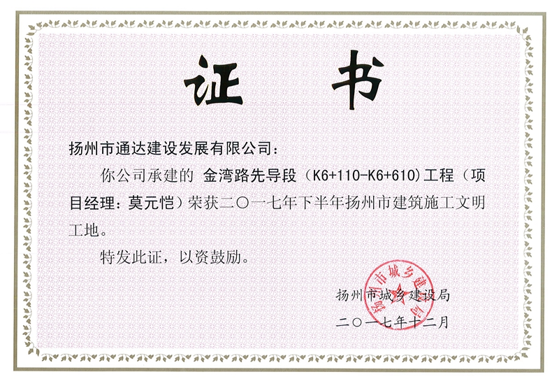 我公司承建的金湾路先导段工程荣获2017年下半年扬州市建筑施工文明工地.