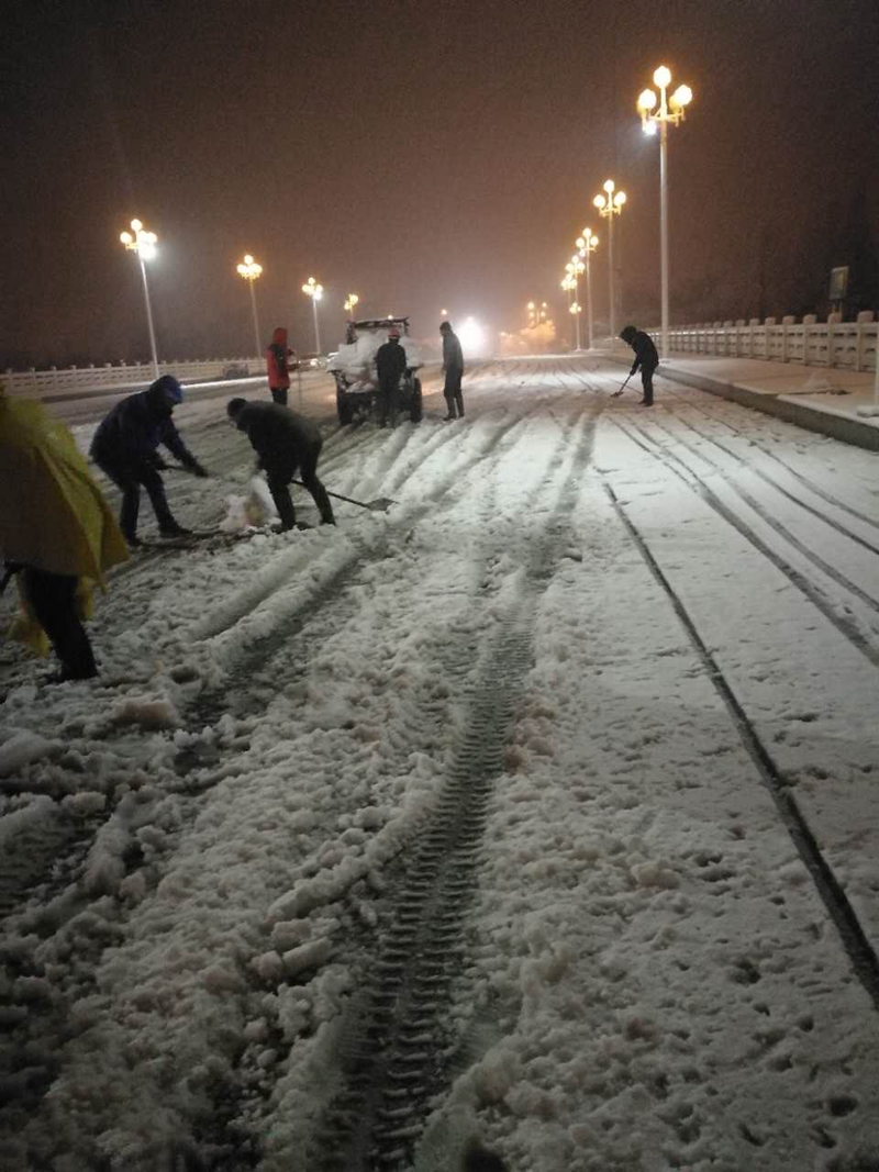 为确保车辆、行人出行安全,4日早上6时,我公司组织100余人,多台机械设备立即奔赴龙川路、龙川桥、仙女庙大桥等城区的重要路段、节点,大家按照分工积极投入到积雪清扫之中。