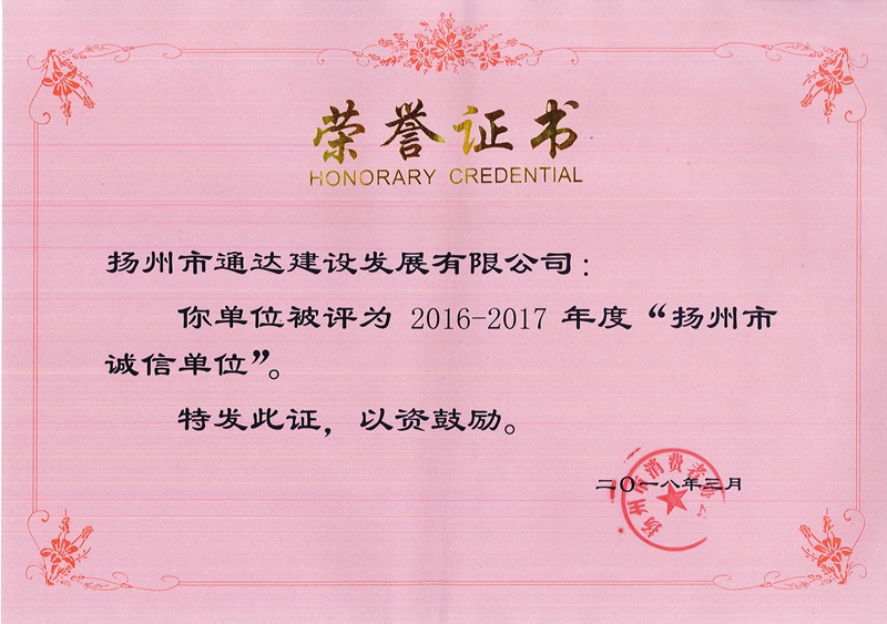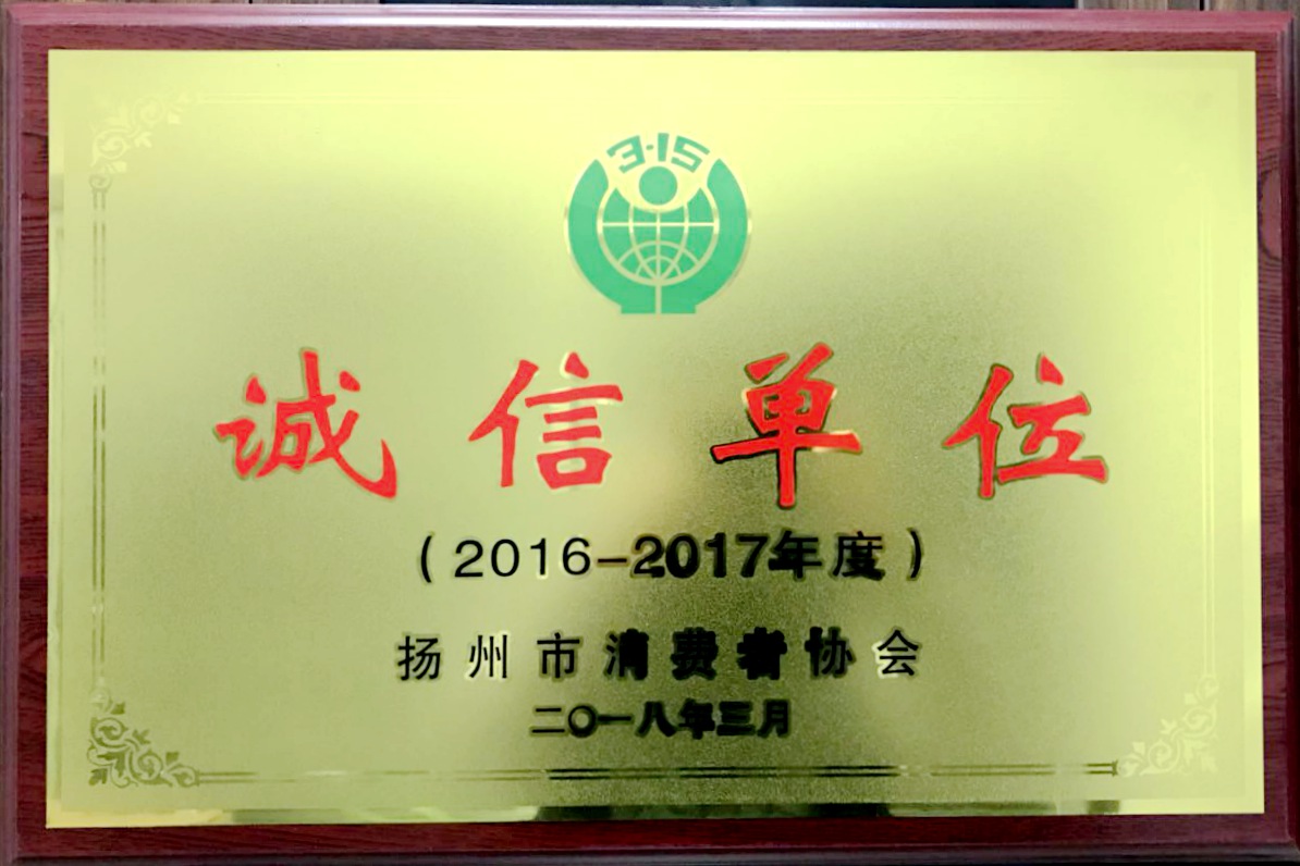 2018年3月我公司被评为2016-2017年度“扬州市诚信单位”。