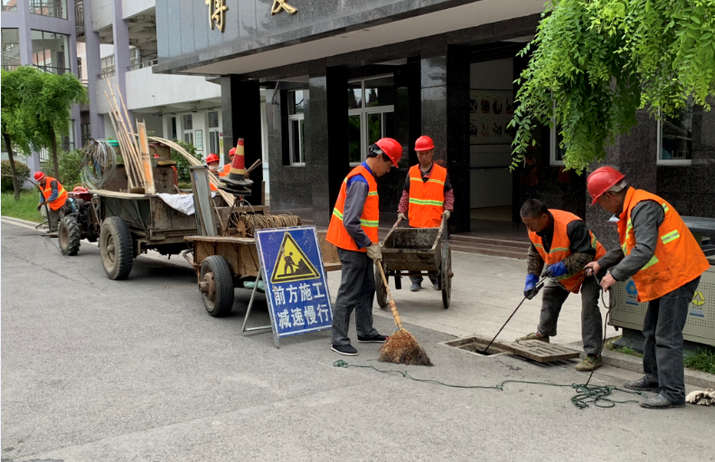 原本安静的校园多了一群忙碌的橙红色身影,他们拿着竹片、清淤花篮、清淤勺等专业工具有条不紊的忙碌着:疏通管道、清运污泥杂物……